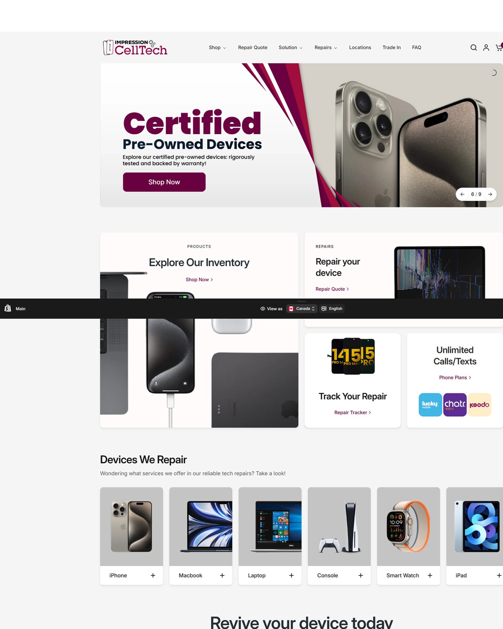 We rebuilt Impression CellTech’s site to turn tech problems into clear next steps. The funnel is intentional: Get a Quote (make/model + symptoms), drop-off, Repair Tracker updates, pickup. Service pages cover screens, batteries, charging ports, cameras/audio, back glass, data recovery—minus the jargon, plus realistic timelines and warranty basics. Because many customers weigh repair vs upgrade, we connected quotes to trade-in flows and a curated Shop (accessories + certified pre-owned) so people leave protected and ready. Location pages, hours, and quick-dial are prominent for walk-ins and same-day parts. Content answers the FAQs that usually jam phone lines—water damage steps, data safety, part quality—while city/service pages strengthen local search (“iPhone screen repair near me”). The mobile experience is thumb-first; buttons and forms are short and always visible. On the backend, staff can update models and pricing ranges fast as new devices launch. Result: fewer “any update?” calls, faster intake at the counter, and a web experience that mirrors the shop’s in-person clarity and pace.