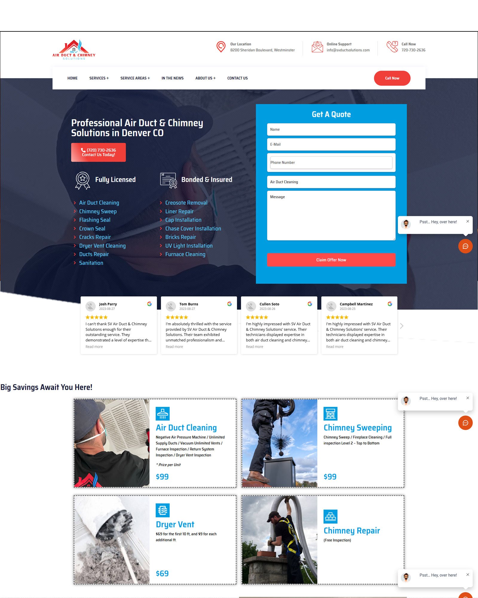 We designed SV Duct’s site as a local lead engine around air-duct, dryer-vent, and chimney safety. The homepage connects air quality and fire prevention in simple terms, then routes visitors to clear service pages with what’s included, how long it takes, and what prep is needed. A short quote form captures home type, system details, and access so crews arrive prepared. Before/after visuals and micro-FAQs answer mess/noise questions and set realistic expectations. City/area sections support local SEO and seasonal reminders (pre-winter chimney checks, spring duct refresh). On mobile, tap-to-call and quick maps are always in reach because most bookings happen on phones. The tone is neighborly and straightforward—evidence over scare tactics—so homeowners feel informed, not pressured. The CMS lets the team add maintenance tips that rank for “dryer vent cleaning near me” and similar queries. Overall, it’s a tidy, credible presence that turns preventive care into an easy yes.